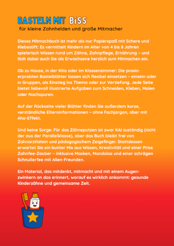 So entstand mein Buch Basteln mit Biss – prall gefüllt mit Bastelspaß, Mitmachseiten und Zahnwissen für Groß und Klein. Und wer weiß? Vielleicht platzt mein Kopf bald wieder vor neuen Ideen, die sich nicht auf ein einzelnes Blatt quetschen lassen. Dann finden Sie auch diese Werke genau hier – als PDF-Bücher.